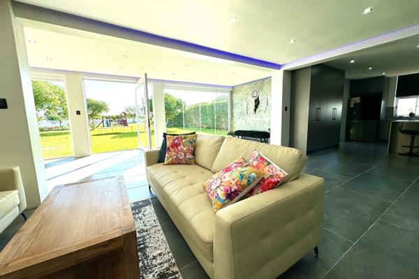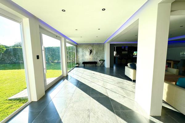 This house is designed for entertaining with a large swimming pool with heated fireplace. This area has a large bar and an enormous area to entertain. A BBQ area with a Pizza oven completes this large space.Modern Aesthetic: The home features a sleek modern design complemented by colored LED lighting, creating a vibrant contemporary atmosphere.Quality Sanware: High-quality sanitary ware is featured in all bathrooms and the kitchen, ensuring functionality and style.Spacious Main Area: Includes a large open-plan lounge, dining room, kitchen, and undercover pool area that can comfortably entertain up to 100 guests.Ultra-Modern Kitchen: The kitchen boasts top-tier finishes and Built-in Cupboards (BIC), along with a separate scullery and laundry area overlooking the lawns and play area.Two Staircases: Conveniently located on the north and west sides of the house, providing easy access to all areas.High-Quality Finishes: Premium materials and finishes are used throughout the home, enhancing its luxurious appeal.