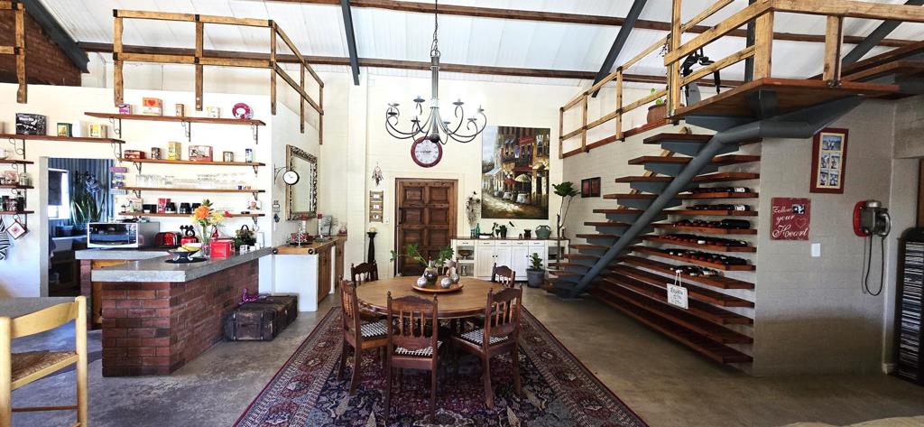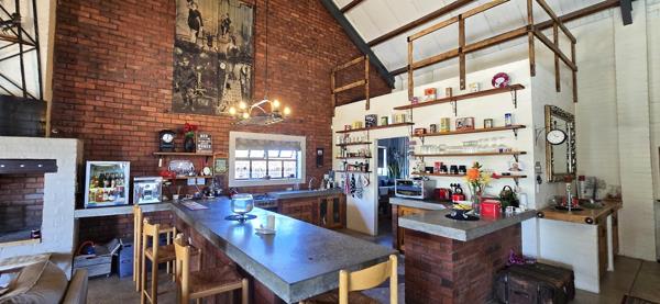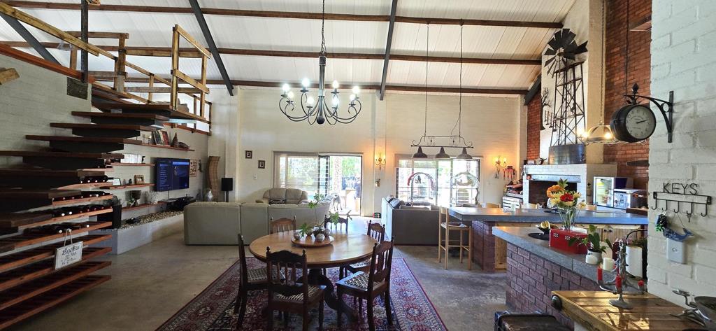 Double-volume ceilings with exposed wooden beams add character to the spacious interiors, where open-plan living areas create a warm and inviting atmosphere. The heart of the home is the beautifully designed kitchen, complete with a separate scullery and laundry room, making it as functional as it is welcoming.