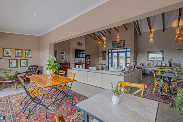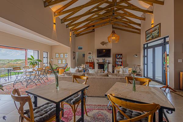 The main residence is a six-bedroom sanctuary, with each spacious en-suite bedroom opening onto a private patio, allowing guests or residents to immerse themselves in the natural beauty and tranquility. The homes heart is a grand living area adorned with high, exposed wooden trusses and a wood-burning fireplace exuding warmth and character. A large entertainment-focused braai room, flowing onto expansive patios, invites seamless indoor-outdoor living, all set against the backdrop of stunning panoramic views. This glorious living space is complemented with a discreet kitchen, scullery, laundry and staff toilets.