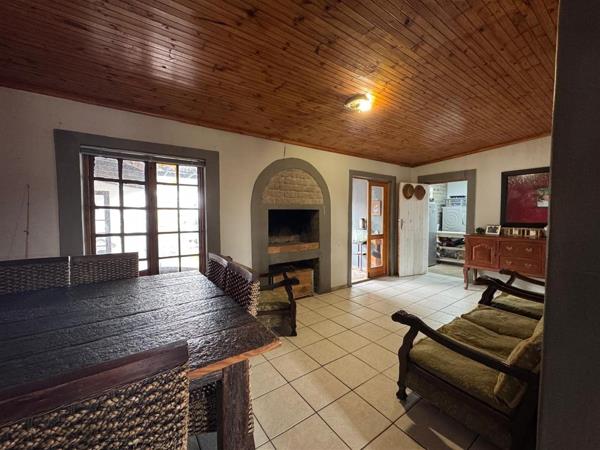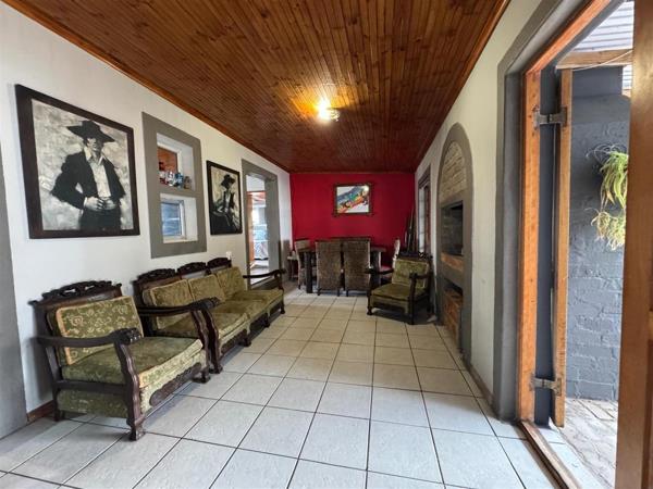 Welcoming undercover stoep leading into an entertainment area with indoor braai
