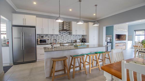 Inside, the home is designed with both relaxation and entertainment in mind. A large indoor braai room with an oversized built-in braai connects seamlessly to the open-plan living, dining, and kitchen areas. The kitchen is enhanced by a walk-in pantry and scullery, making it as practical as it is stylishideal for everyday living and entertaining alike.