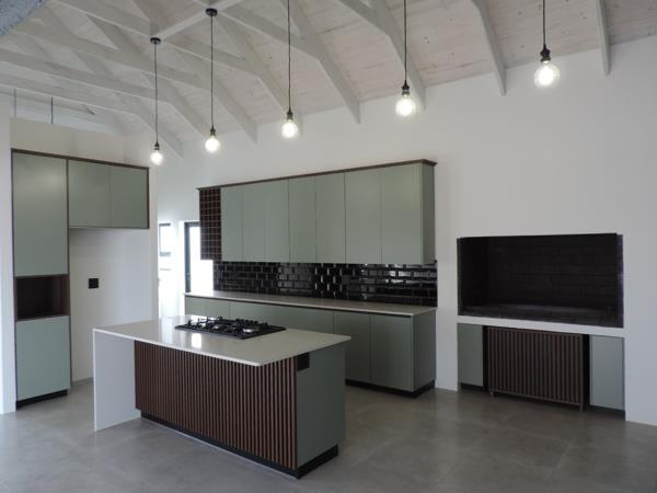 Seamlessly connected yet distinctly defined spaces. The braai room includes a built-in braai cleverly integrated to maximize floor space. Sliding doors lead from the living area to the garden via an inviting wooden patio, enhancing indoor-outdoor living.