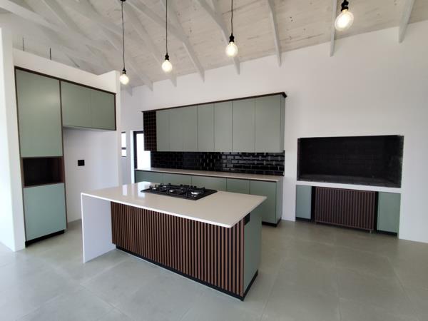 The home features a modern, open plan design with spacious living areas, an indoor braai for year-round entertainment and a well appointed kitchen. All three bedrooms are comfortably sized, with the main bedroom offering an en-suite bathroom. A double garage provides secure parking and additional storage space.