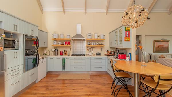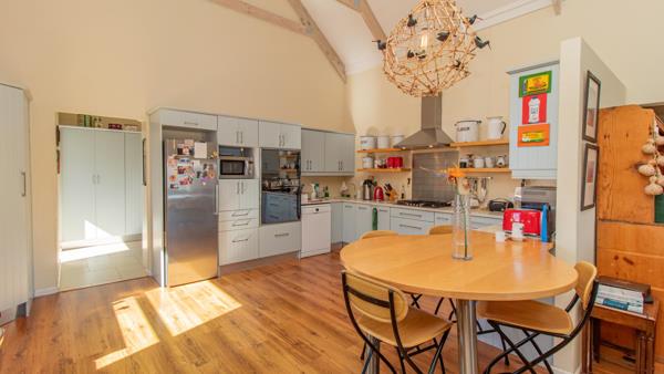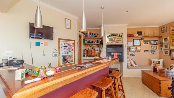The top floor offers the main living and entertainment area and comprises a large open plan lounge, bar area and kitchen. The bar has a built-in braai, and the lounge has a jet-master fireplace. Next to this is a large dining room. The kitchen is open plan and has a built-in gas hob and built-in electric oven. Behind the kitchen is a large scullery.
