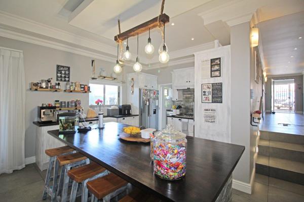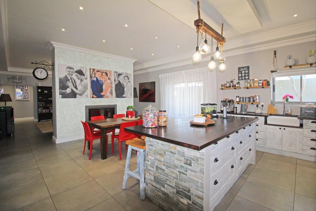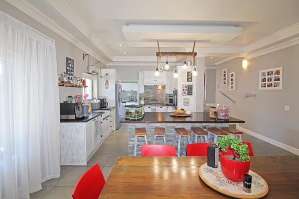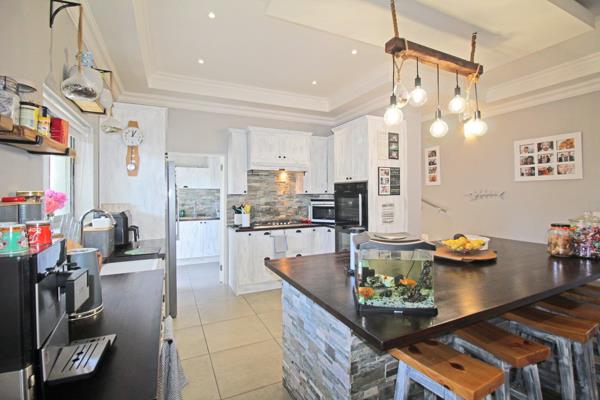 Upon entering, youll be greeted by an expansive entrance hall leading to the open-plan kitchen and dining area, this space is perfect for both everyday family gatherings and entertaining guests. The kitchen boasts modern fixtures, with ample counter space that is solid wood, cupboards and a large center island, breakfast bar, gas hob, eye-level electric oven, a beautiful prep bowl with a sliding window for natural light, a separate scullery and laundry.