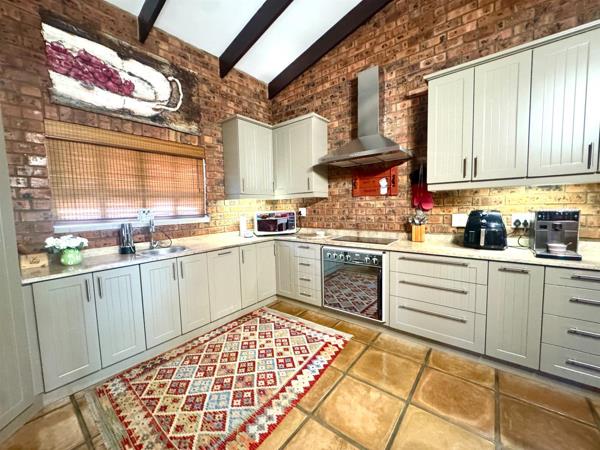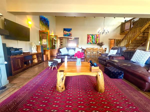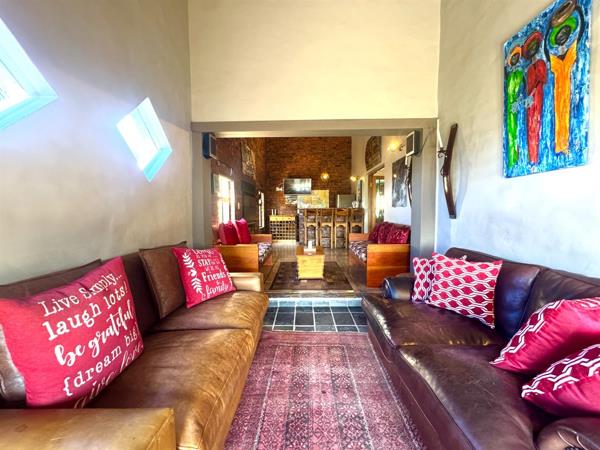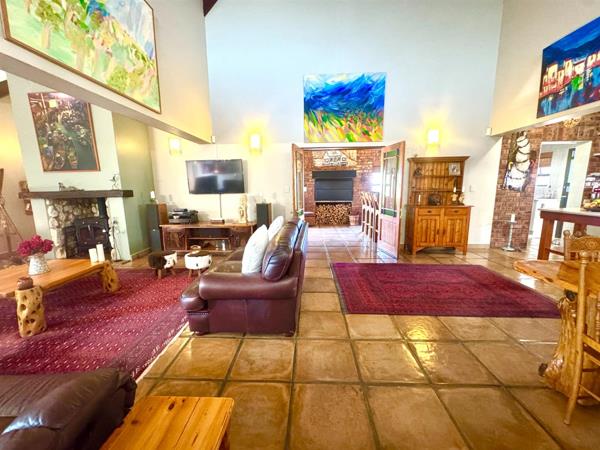 The house features a traditional designed tile type flooring and farm style glass paned doors. The open trusses and cozy fireplace sets the tone for relaxed, country-style living. The double-volume ceilings and high windows allow natural light to flood the living areas, creating a bright and welcoming atmosphere. Facing North West, the lounge and living areas beams with sunlight in the afternoons, ensuring warmth and happiness.