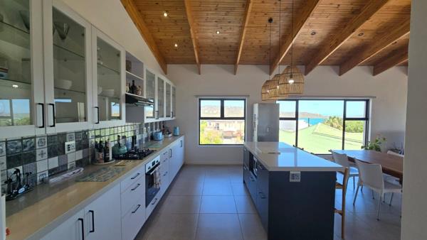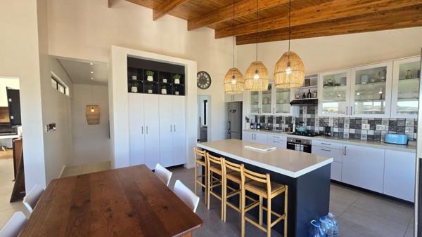 The architectural design celebrates space and natural light. High ceilings, expansive windows, and clean lines draw the eye to the panoramic lagoon views, creating a living environment that feels both airy and sophisticated. The open-plan living and dining area connects seamlessly to a modern, well-appointed kitchen. Fitted with high-quality cabinetry, sleek countertops, and a generous breakfast counter, this space is both beautiful and practical ideal for entertaining or family gatherings. A built-in braai, large sliding doors open onto a covered balcony with stunning lagoon views.