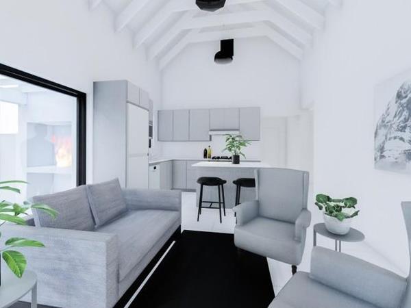 Open-Plan Design: The kitchen and living area boast sleek finishes with clean lines and minimalist decor.
