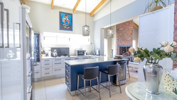 The heart of the home is the modern kitchen, overlooking the open-plan dining area and lounge, all complemented by stunning double-volume ceilings that enhance the character and charm of the living spaces.
