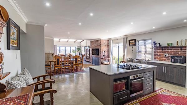 The expansive open-plan living area combines a lounge, dining room, and a built-in braai with custom wooden storage drawers creating a relaxed and social environment for gatherings. The kitchen is the heart of the home, boasting solid cabinetry, quartz countertops, a pantry cupboard, and a separate scullery for convenience.