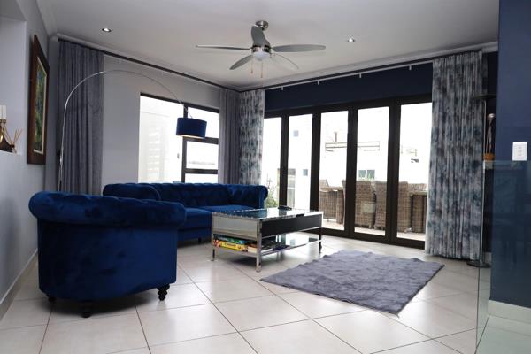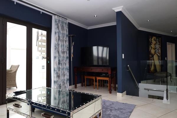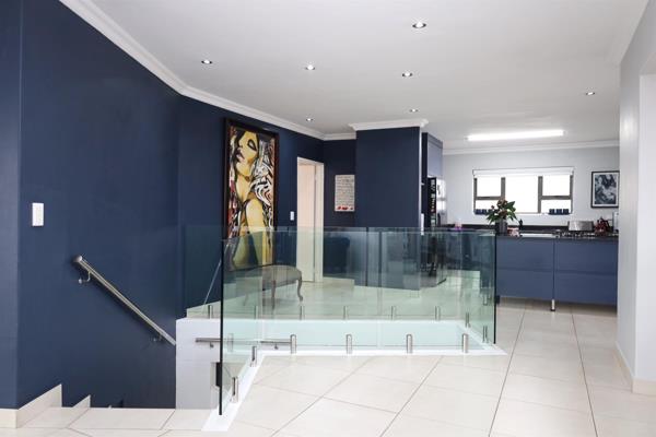 Upstairs, a staircase with glass balustrades leads to the open-plan living, dining, and kitchen area, alongside the main en-suite bedroom. The master suite includes a spacious bathroom and sliding doors that open onto a private balcony.