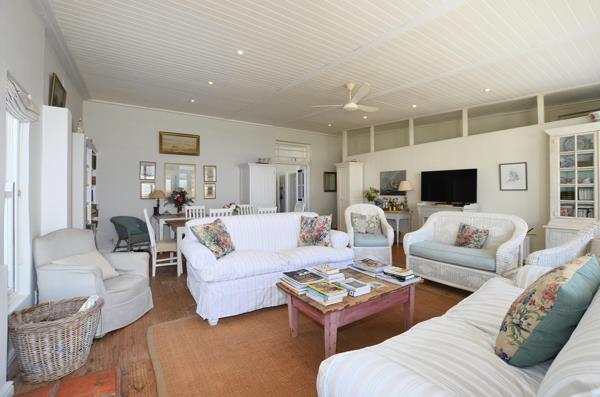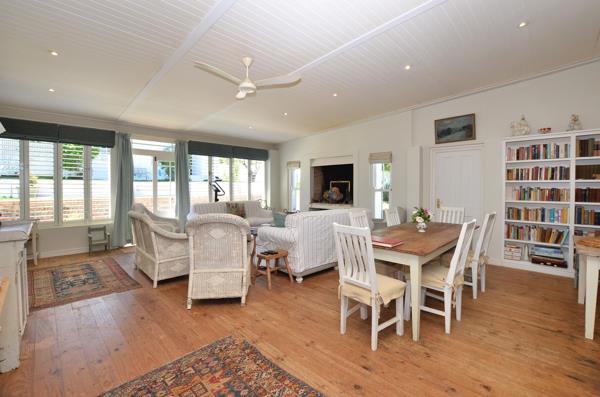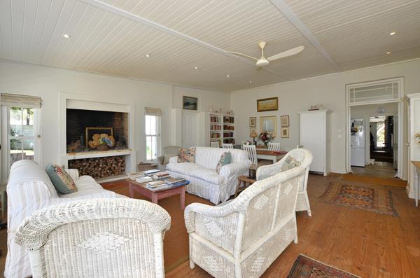 It includes three bedrooms and three full bathrooms two en suite, a kitchen with a pantry, dining room, two lounges both with fireplaces, a study, and a long hallway lined with built-in bookshelves. The original wooden floors and high ceilings add to the homes authentic feel, while the large extended sun lounge with American shutters opens onto the garden in summer or stays warm around the built-in fireplace and braai through winter.