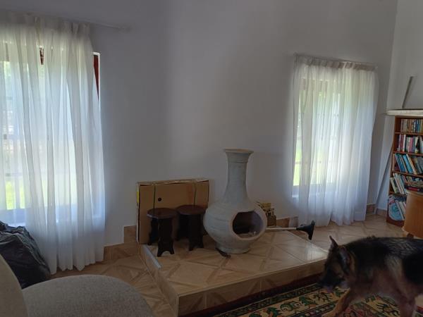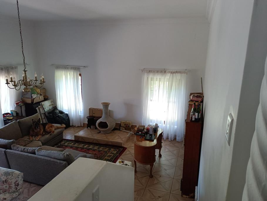 Approaching the house from the main gate you are immediately drawn by the handcrafted stone exterior of the house whilst you are welcomed by a large porch and a built-in braai for entertainment and enjoyment of endless panoramic sunsets. Entering the house, you are welcomed by a large lounge incorporating a dining area with high ceilings and a bio-fuel echo friendly ceramic fireplace, ideally for those cold winter nights. A set of stairs takes you to the next level which consist of a 1 bedroom en-suite with fully functional bathroom and the kitchen area with the backdoor leading to the outside of the enormous erf. A double garage, housing the solar inverter and charge controller, has a fully automated garage door. The garage is linked to the house and there is therefore direct access to the house.