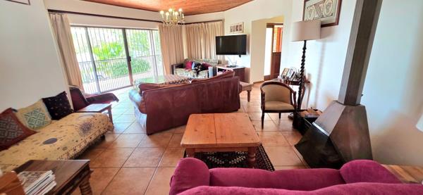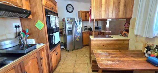 The interior boasts a spacious, open-plan living and dining area, illuminated by abundant natural light through large sliding glass doors. A distinctive wood panel ceiling and partly tiled flooring define these communal spaces, with a freestanding fireplace adding ambiance. The functional kitchen features extensive solid wood cabinetry, tiled countertops, a built-in double oven, and an integrated breakfast nook. Accommodation includes four well-proportioned bedrooms, two bathrooms (one en-suite), a additional guest toilet, and a dedicated study.