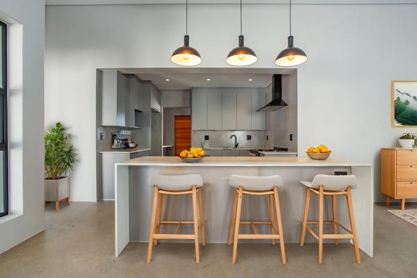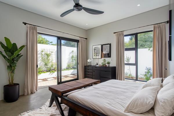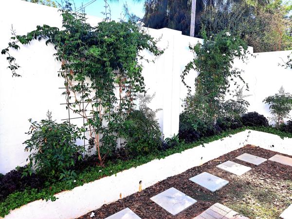 A Modern home serving modern needs. Spacious 3 Bedroom home with high quality features within walking distance of the town centre. With only 4 units in this complex, it retains privacy while sharing perimeter walls and an access controlled driveway. The design incorporates what has become essentials and comes fully equipped with 8 solar panels, inverter and batteries, while proper insulation offers better temperature and noise control. The open plan living area and kitchen leads to the undercover patio with built in braai, providing many entertainment options. The feeling of spaciousness is amplified by high shadow-line trimmed ceilings. The finishes are neutral yet striking, with polished cement floors and ceiling fans throughout, engineered stone countertops in kitchen and scullery and built in cupboards in all the bedrooms. A neat water-wise landscaped garden finishes the surroundings of this home perfectly. Floor plans available on request and Sectional Title Scheme to be registered.