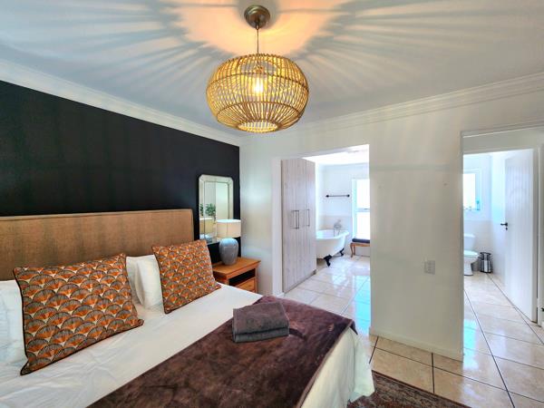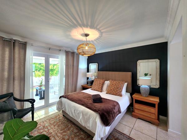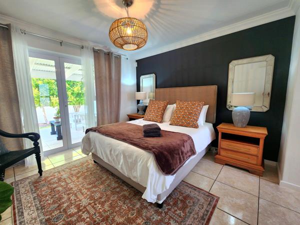 Step inside to a bright, open-plan living area with seriously high ceilings and a welcoming atmosphere. The lounge complete with a big built-in fireplace for cosy winters flows into the dining room, and both open through stacking doors onto a massive covered patio. This patio runs the entire length of the house perfect for weekend braais, summer dinners, or lounging while the kids play on the lawn. Mature trees surrounding the garden create natural privacy and a calming, green backdrop. The kitchen has a warm, country feel with plenty of cupboard space and wide countertops plus gorgeous views of fruit trees and the Riebeek mountain range. The main bedroom is conveniently situated downstairs with a full en-suite bathroom and French doors that open directly to the patio. Youll also find a guest loo on this level.