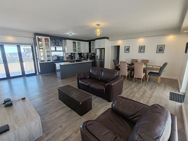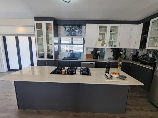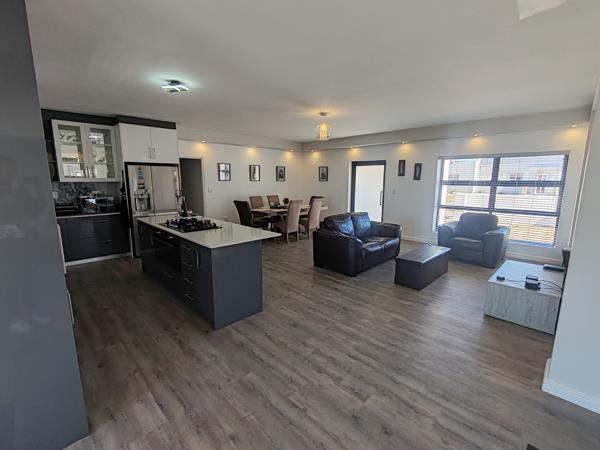 The open-plan kitchen, lounge and dining area create a warm and inviting atmosphere. From here, you walk out onto a patio with a built-in braai, overlooking the estate and offering beautiful views of Saldanha Harbour.