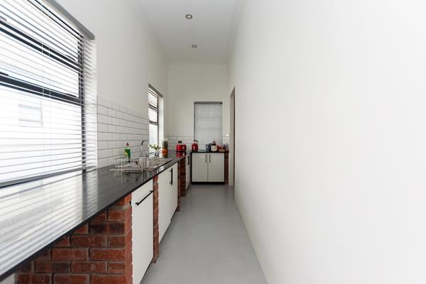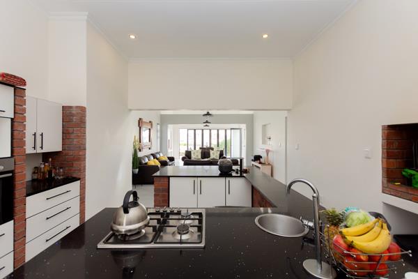 As you enter, you are welcomed into a spacious dining area with a family-friendly indoor braai area and double-volume ceilings, creating a warm and open atmosphere.