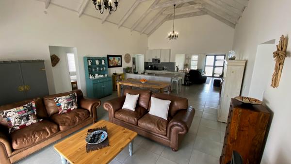 The living entertainment area is spacious and features double volume exposed trusses. The entertainment area ends with a built in braai leading out and opens up to a lovely sheltered patio.