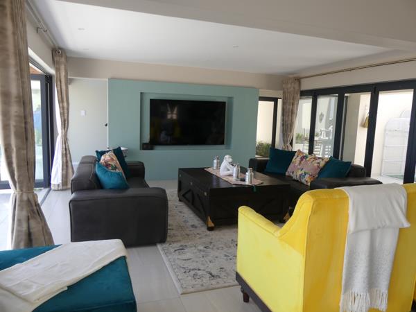 Large open-plan lounge and dining room with access to a sheltered braai area with a built-in braai.