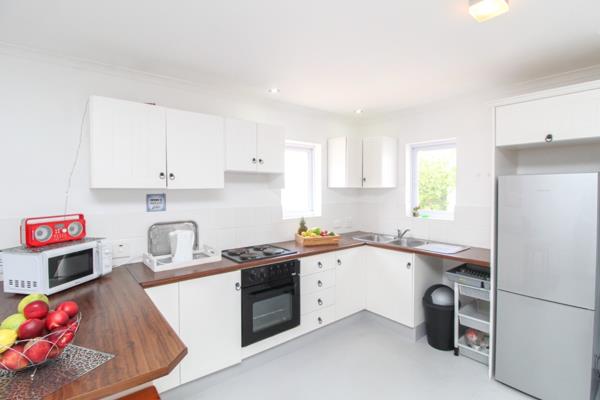 The ground floor features a spacious open-plan kitchen, dining and living area, designed for relaxed family living and effortless entertaining. The living area boasts a built-in indoor braai, creating a warm and inviting atmosphere year-round. Sliding doors open seamlessly onto a beautiful paved patio with an outside braai, ideal for hosting friends and enjoying West Coast evenings.