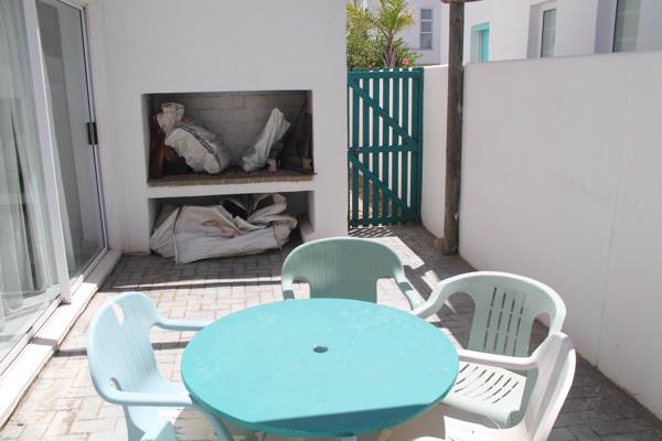 Sliding door that leads from the living space to a covered outdoor patio with a second built-in braai, creating an inviting indooroutdoor entertainment area. The garden is easy to maintain and pet-friendly.