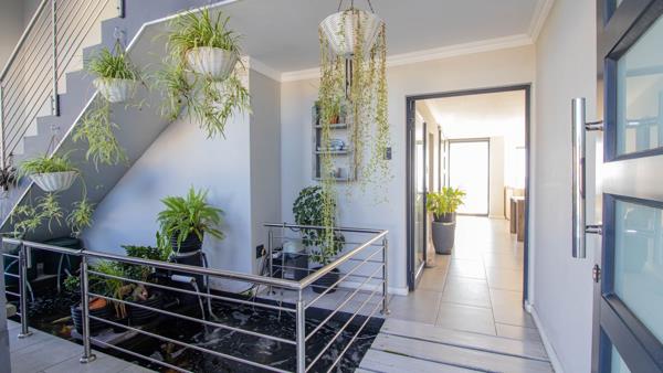 A grand entrance hall featuring a tranquil koi pond, setting the tone for refined coastal living.