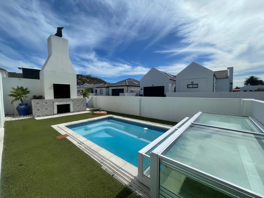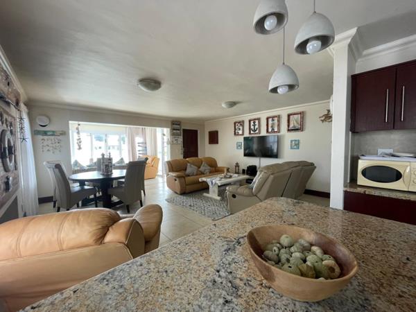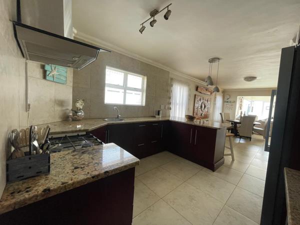 This double-storey home in Sandy Point Beach Estate offers three bedrooms and three bathrooms. The layout includes an open-plan kitchen, dining, and living area with aluminium windows and sliding doors that bring in natural light. The bedrooms are spacious with built-in cupboards, and the main bedroom has its own en-suite bathroom.