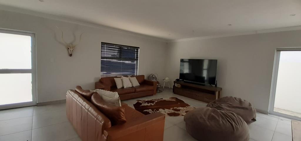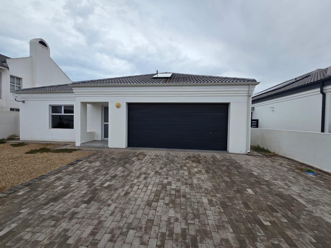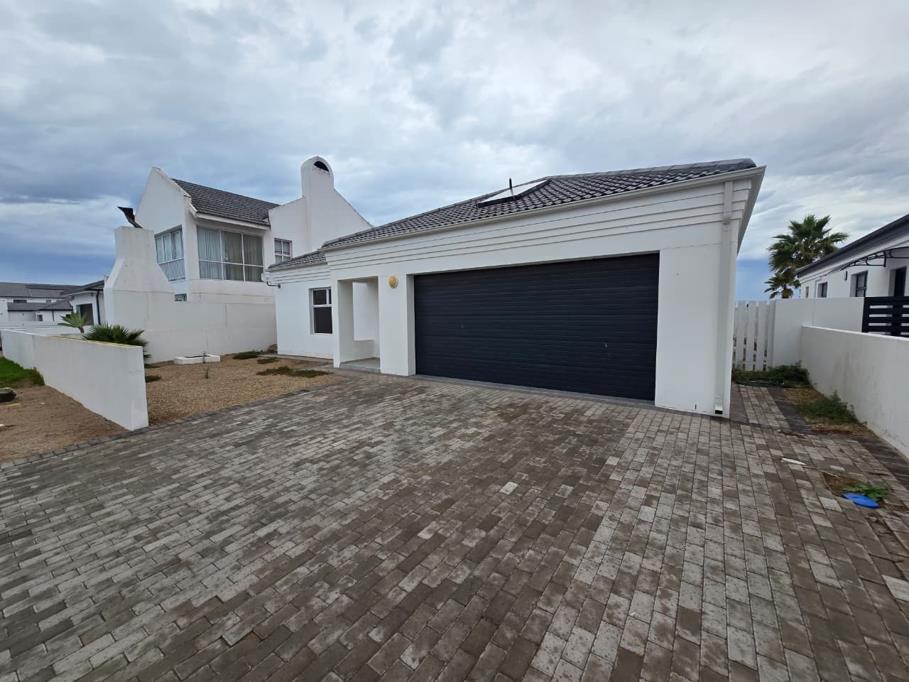 This contemporary residence, situated within the esteemed Sandy Point Beach Estate in St Helena Bay, presents an exceptional opportunity for discerning buyers. The property exhibits a modern aesthetic with a clean white exterior, dark tiled roof, and a paved driveway leading to a double integrated garage. A solar hot water panel underscores a commitment to efficiency.