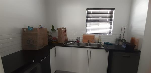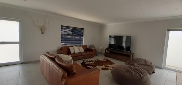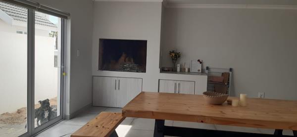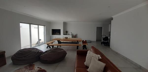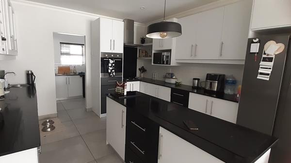 Upon entry, the interior reveals a meticulously designed open-plan living and dining area, characterized by abundant natural light, elegant tiled flooring, and a neutral colour palette. The space seamlessly integrates a built-in braai, ideal for entertaining. The modern kitchen, featuring a striking black and white design, boasts extensive cabinetry, black countertops, a central island, and built-in appliances. A dedicated scullery enhances functionality.