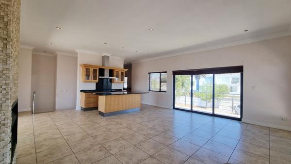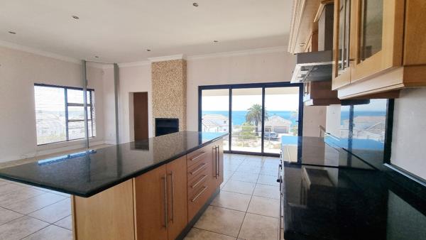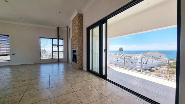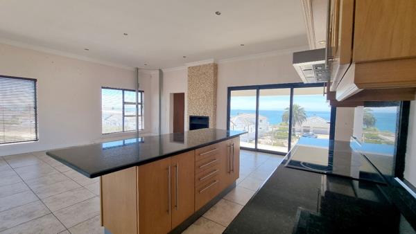 The living and dining area opens up onto a large under cover balcony with a built-in braai overlooking the ocean in front and the pool