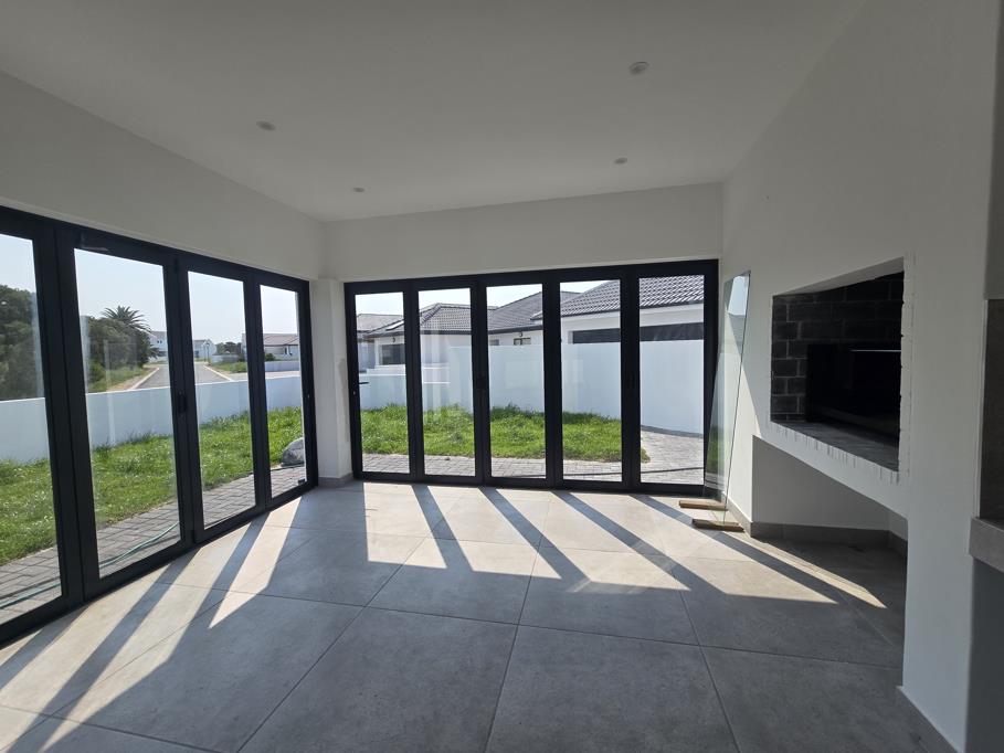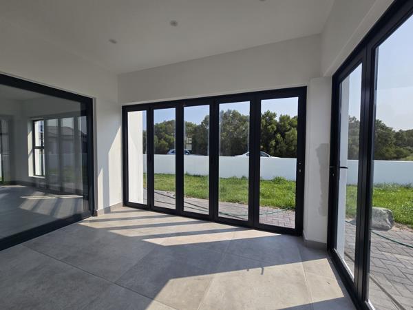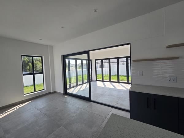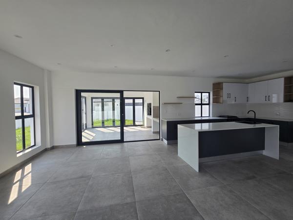 A welcoming entrance leads to a generous open-plan living space that effortlessly connects the dining area, living room, and modern kitchen. A convenient and well-placed guest toilet is also provided. The living area extends into a large braai room, ideal for entertaining, and opens out to the surrounding garden.