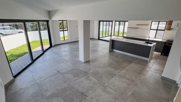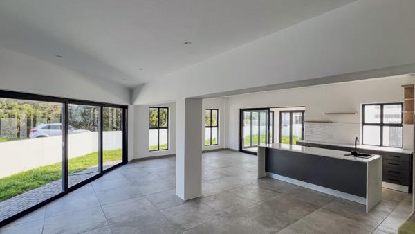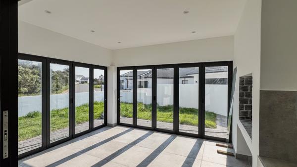 The living areas extend into a spacious braai room, designed with year-round entertaining in mind. Sliding doors open to a private garden, offering the ideal setting for outdoor dining, summer braais, or simply unwinding in the fresh coastal air.