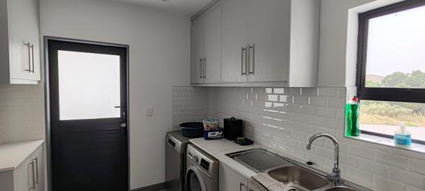 Kitchen: Modern and open-plan, featuring a glass top stove, eye-level oven, extractor fan, ample cupboard space, and a prep bowl. The adjacent scullery is spacious and equipped with connections for kitchen appliances.