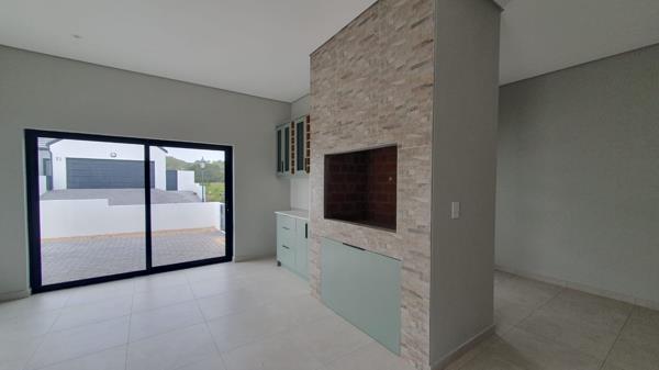 The elegant house features a spacious, open-plan kitchen and living area with a built-in braai.