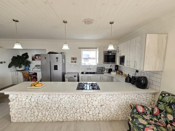 Upstairs, the open-plan kitchen and living area create a warm and inviting space, enhanced by a charming wood-burning stove that adds character. The master bedroom offers generous built-in cupboards(with a lock-up safe), while the family bathroom serves both as a guest facility and for the main bedroom. A small workstation in the living area provides a dedicated space for work or creative projects. Stacker doors open onto a balcony with an additional built-in braai, where you can take in stunning ocean views. All furniture and appliances are available at additional cost.