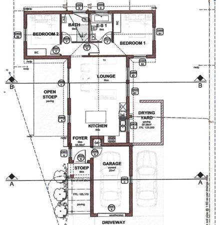 PLAN A: Open plan lounge & kitchen, 2 bedrooms, 2 bathrooms, single automated garage that opens directly into the house. Good size open stoep and a dry yard . Total covered = 103sqm.