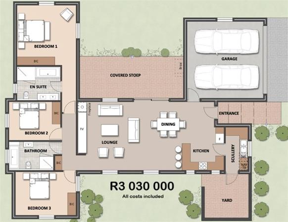 PLAN D: Open plan lounge & kitchen with a separate scullery, 3 bedrooms, 2 bathrooms, automated double garage that opens directly into the house. Roofed patio, dry yard, Roll-on lawn on the entire plot.