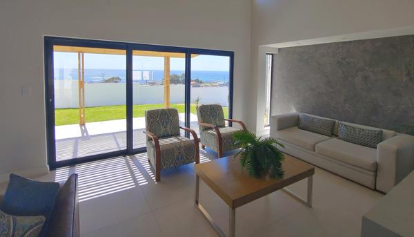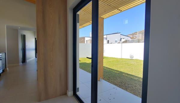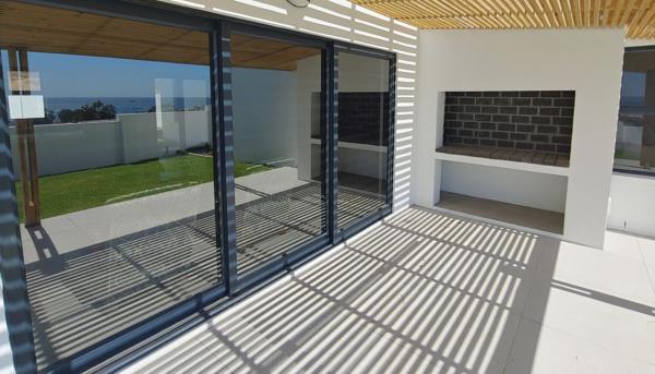 Sliding doors to sea-facing tiled, shaded braai patio