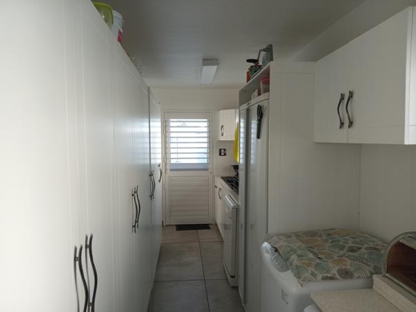 The kitchen boasts sleek white cupboards and quartz countertops, combining style with functionality. Adjacent to the kitchen is a well-appointed scullery, offering ample storage and space for a dishwasher, washing machine, and tumble dryer. A built-in braai between the kitchen and scullery adds a delightful touch for culinary enthusiasts.