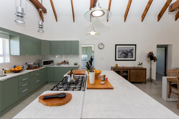 The home showcases a uniquely designed roof, complemented by a slow-combustion fireplace in the open-plan lounge area and an indoor braai for year-round entertaining. The spacious kitchen includes a scullery/laundry matt, flowing seamlessly into the dining area. An open patio extends from the dining room, leading to an enclosed garden.