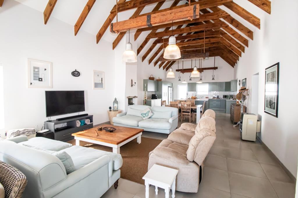 Step inside through large glass doors into a bright and airy open-plan living space. The seamless flow between the lounge, dining area, and kitchen creates the ideal setting for entertaining or relaxing with family. The lounge features an inviting indoor braai and is anchored by striking exposed wooden beams and elegant lighting that enhance the coastal charm of the home.