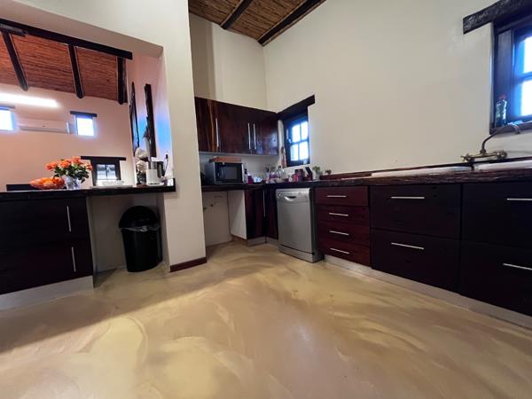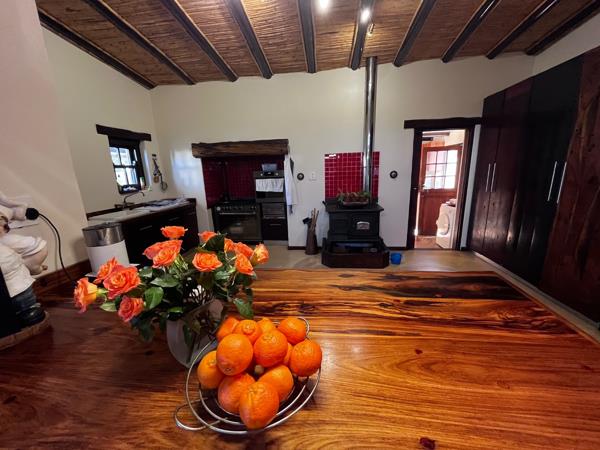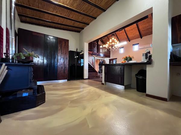The home radiates a true South African style with natural sleeper wood finishes throughout that brings warmth, texture and a timeless earthy charm to every space. The open-plan lounge comes with underfloor heating, a built-in fireplace and a statement chandelier, creating a cozy yet elegant ambiance for those chilly winter nights.