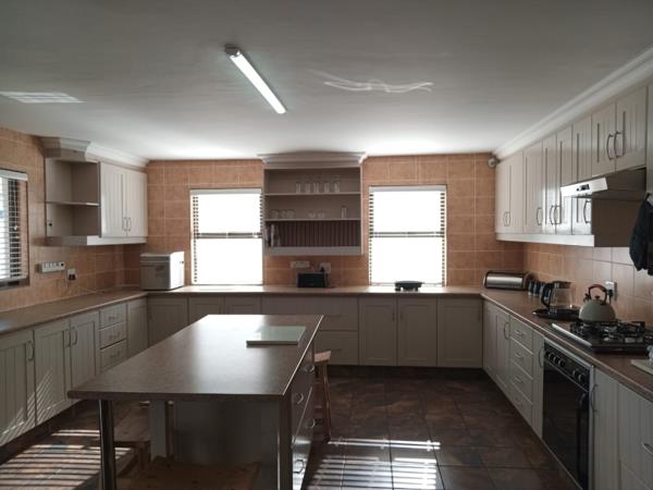 The charming farm-style kitchen features ample cupboard and countertop space, a 4-plate gas hob, built-in oven, and extractor fan. A separate scullery provides extra storage and space for a dishwasher, keeping the living areas neat and tidy.