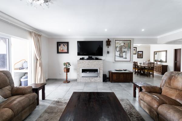 The lounge area, featuring a cozy gas fireplace, seamlessly connects to the outside covered braai area through elegant stack doors, perfect for entertaining.