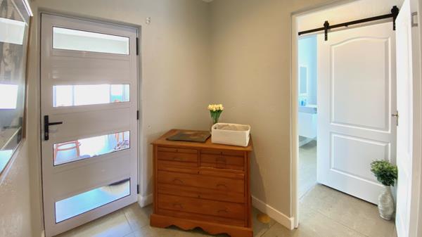 Open Concept: The main living spacecomprising the bespoke lounge, dedicated braai room, and formal dining areaflows seamlessly into the gourmet kitchen. The space is accentuated by designer light fixtures and bespoke white blinds, with glass sliders maximizing the West Coast light and air flow.