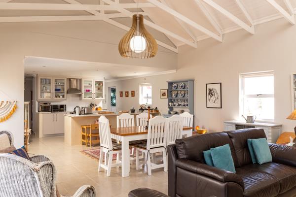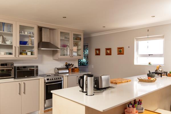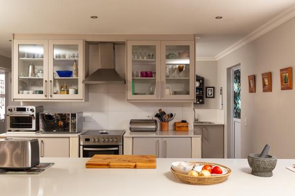 The living area is spacious and includes a dining and lounge area. The living area features open trusses. From the lounge you enter the braai room, which opens onto the North facing courtyard with the splash pool. The house is designed in such a way that you can enjoy views of the river from the living area window, as well as the neighbour''s beautifully landscaped garden.