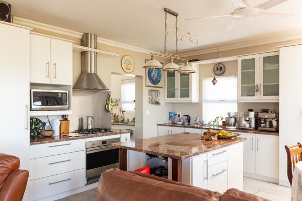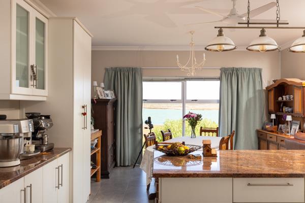 The kitchen is open plan with a scullery and overlooks the river. The open plan living area includes the kitchen, dining and lounge space, and features an indoor braai. Large doors open to a covered stoep with a built in braai and the pool - a wonderful area for relaxing and entertaining.