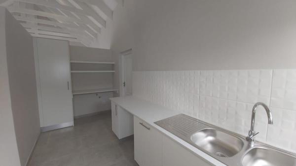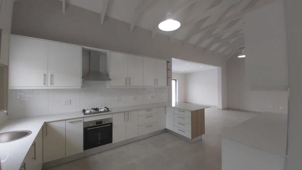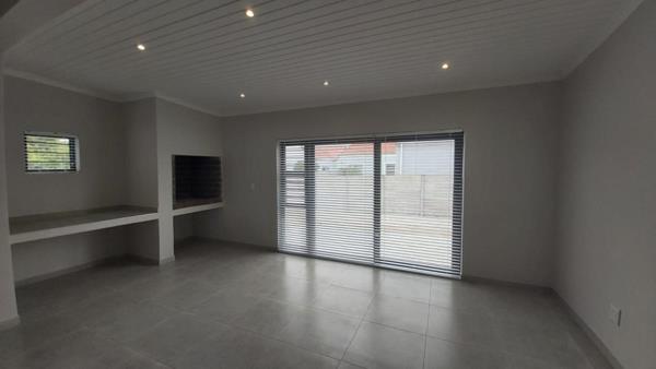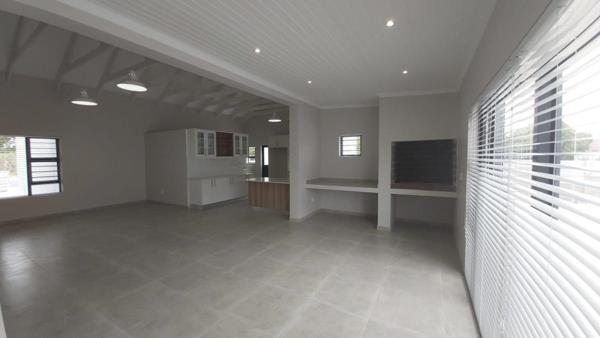 The home features a spacious open-plan lounge, dining, and kitchen area that flows effortlessly into the indoor braai room, complete with a built-in braai and large glass sliding doors leading out to the back garden. This creates the perfect setting for relaxed living and entertaining. The modern kitchen offers ample cupboard space, beautiful countertops, a gas hob, and a built-in oven, with a separate scullery and pantry for added convenience.