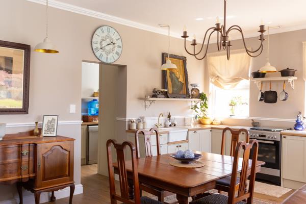 The open plan kitchen and lounge are designed for both comfort and style, featuring a gas fireplace and a wooden lintel sourced from Rooibaai adding a touch of history and character. The kitchen includes a scullery/laundry with a backdoor leading to a private courtyard with a washing line.
